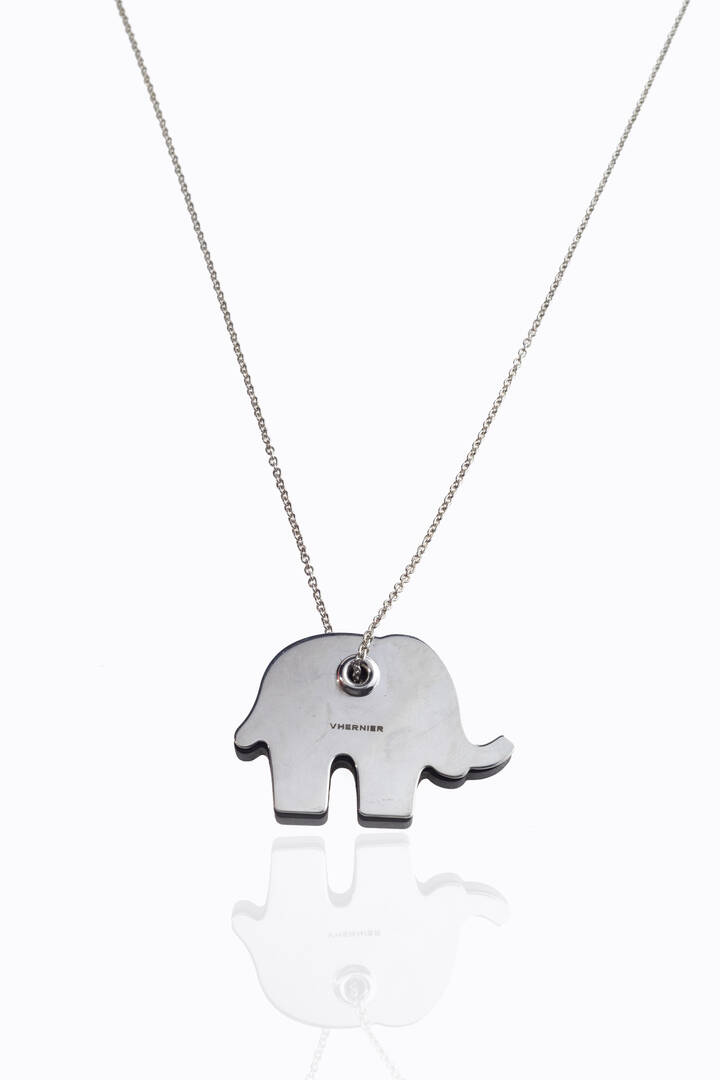 Catena e ciondolo in argento 925/1000 firmato Vhernier a forma di due elefanti di cui uno in legno Corredato di astuccio della maison