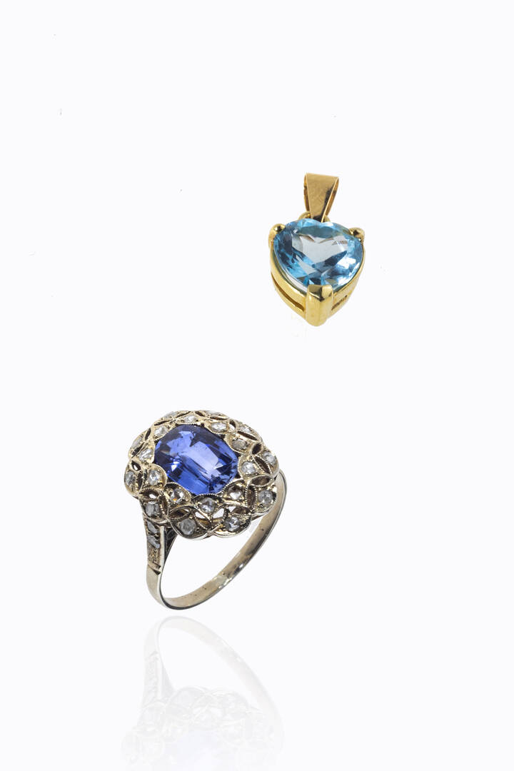 composto da: -ciondolo in oro giallo a forma di cuore con topazio azzurro. Peso gr 3 -anello in oro bianco inizi XX secolo con pietra sintetica blu e rosette di diamanti per totali ct 0 20 ca. Peso 3 8. Misura 18 (58)