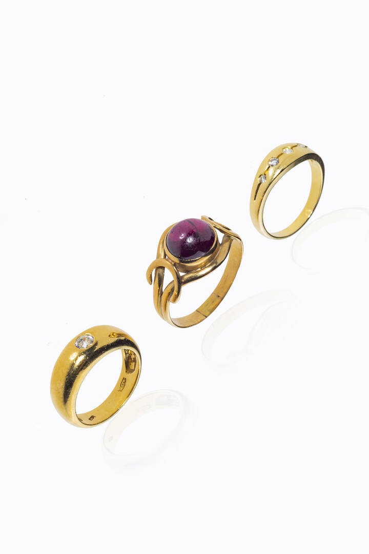 composto da: - in oro giallo a bassa caratura con granato taglio cabochon al centro inizi XX secolo. Peso gr 4 3. Misura 21 (61) -in oro giallo a fascia bombata con diamantino taglio brillante di ct 0 15 ca. Peso gr 5 7. Misura 8 (48) -in oro giallo sommità con cinque diamantini taglio brillante per totali ct 0 12 ca. Peso gr 3 9. Misura 13 (53)