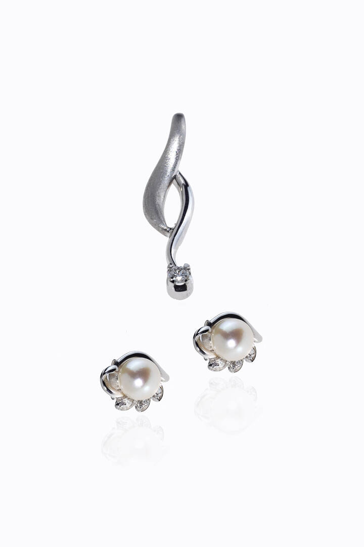 in oro bianco composto da: -ciondolo di forma fantasia con diamante taglio brillante di ct 0 03 ca. Peso gr 1 5 -coppia di orecchini in oro bianco a lobo con due perle giapponesi del diam. di mm 6 5 ca e diamanti taglio brillante per totali ct 0 05 ca. Peso gr 3 1