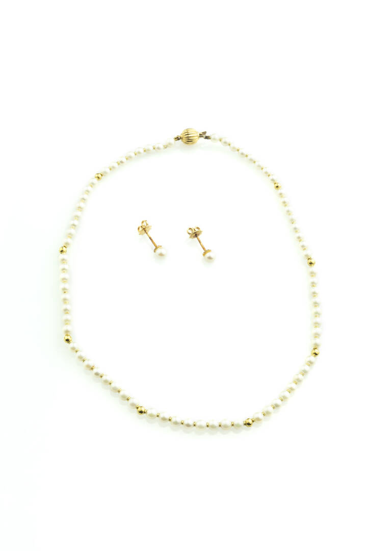 Lunghezza cm 40 composta da girocollo di perle giapponesi del diam di mm 4 5 ca alternati a sfere in oro giallo. Chiusura a sfera fesonata in oro giallo; ed orecchini a lobo con due perle giapponesi