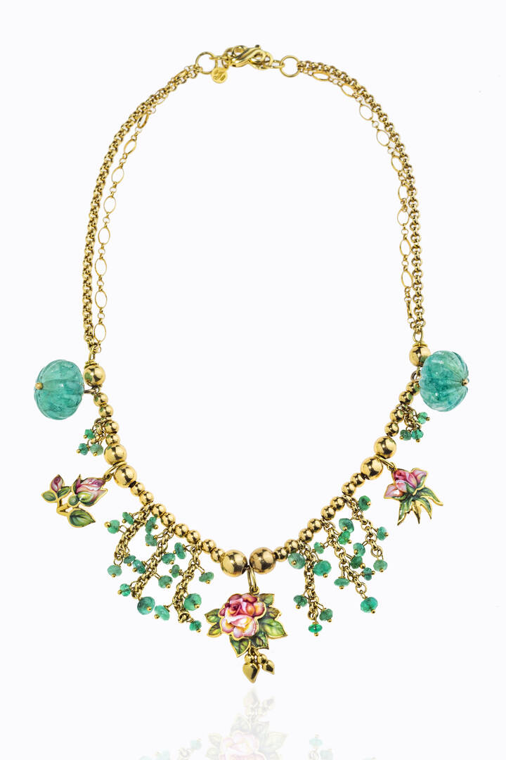 Lunghezza cm 40 Peso gr 43 4 Girocollo in oro giallo firmato Gabriella Rivalta con rose smaltate dischi e sfere fesonate di smeraldi dal diam di mm 16 5 ca e 3 ca