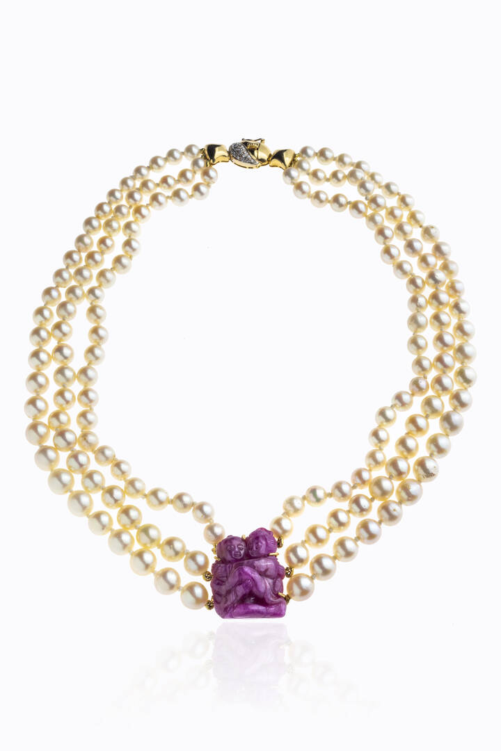 Lunghezza cm 45 composta da tre fili di perle giapponesi a scalare dal diam. di mm 6 8 a 8 7 al centro ciondolo in radice di rubino inciso con scena erotica. Chiusura geometrica in oro giallo con diamanti taglio 8/8 per totali ct 0 15 ca