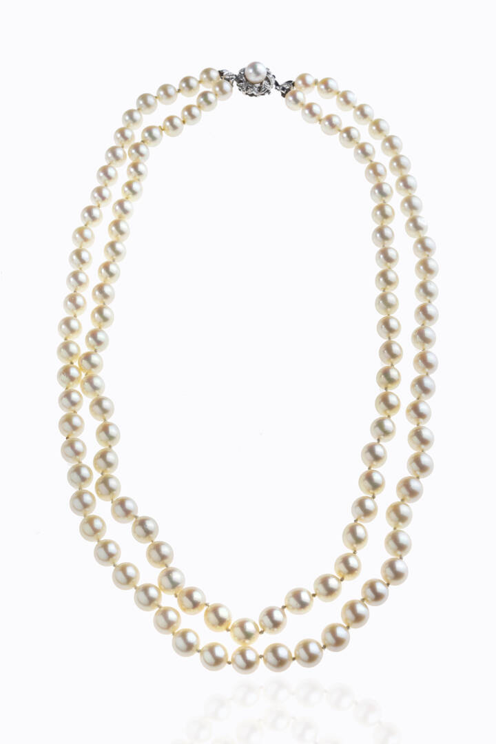 Lunghezza cm 45 composto da due fili di perle giapponesi del diam di mm 7. Chiusura in oro bianco con perla