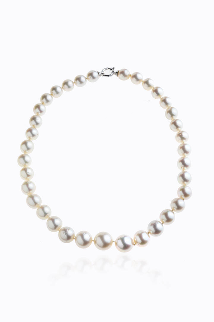 Lunghezza cm 46 composto da un filo di perle australiane dal diam. di mm 11 a 14 2. Chiusura ad anello in oro bianco