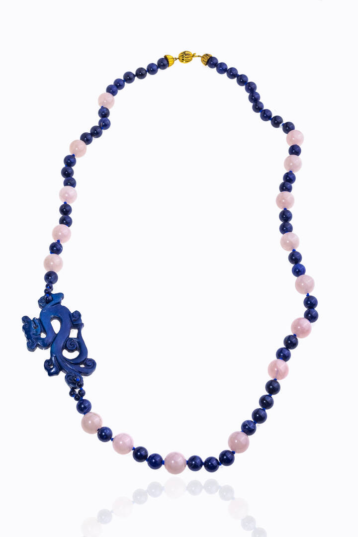 Lunghezza cm 86 composta da sfere di lapislazzuli del diam di mm 10 ca alternati a sfere di quarzo rosa del diam di mm 14; al centro dragone in pietra dura blu. Chiusura in argento dorato