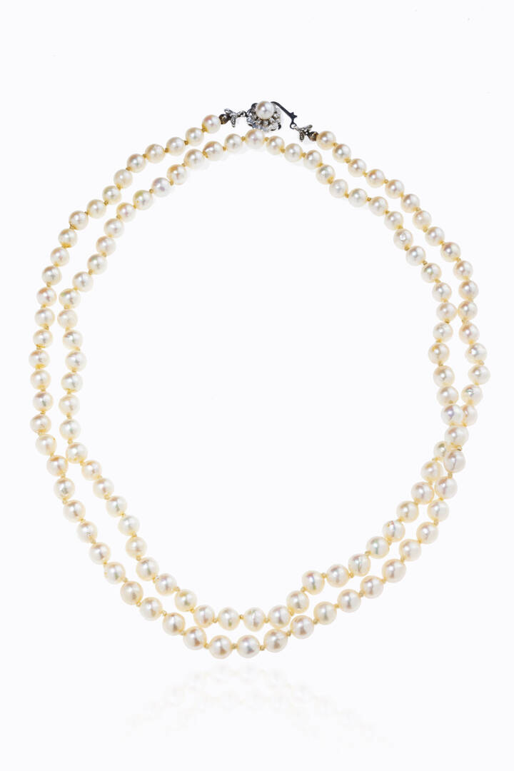 Lunghezza cm 93 composta da un filo di perle giapponesi scaramazze del diam di mm 6 5-7 ca. Chiusura in oro bianco con diamanti taglio 8/8