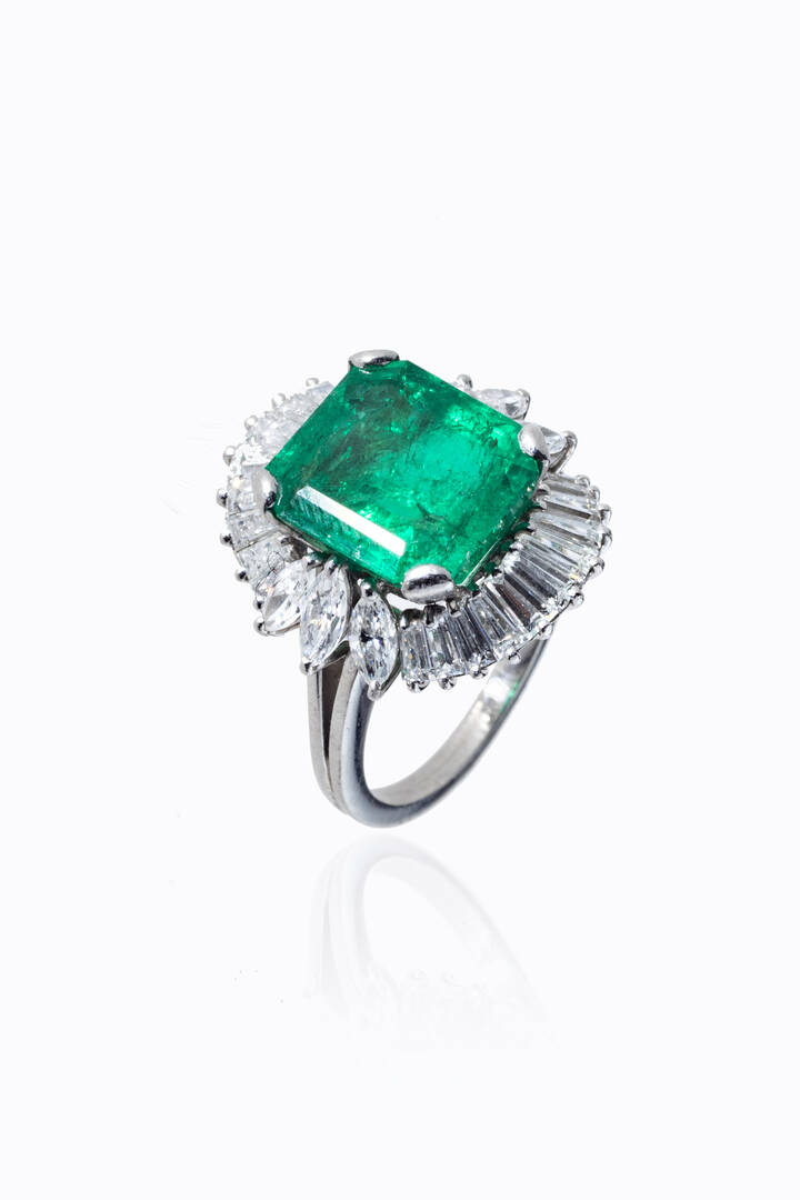 Peso gr 10 2 Misura 12 (52) in platino al centro smeraldo colombiano di ct 6 0 ca (scheggiature) con contorno di diamanti taglio trapezio e navette per totali ct 1 40 ca