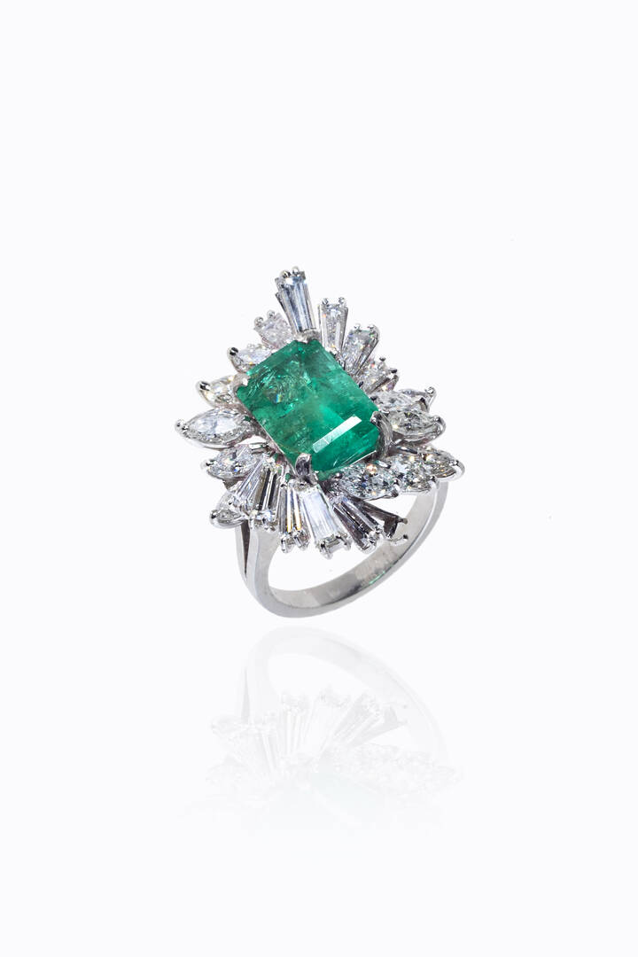 Peso gr 10 4 Misura 12 in oro bianco al centro smeraldo taglio ottagonale a gradini di ct 5 0 ca e contorno di diamanti taglio trapezio (una mancante) e navette per totali ct 3 0 ca