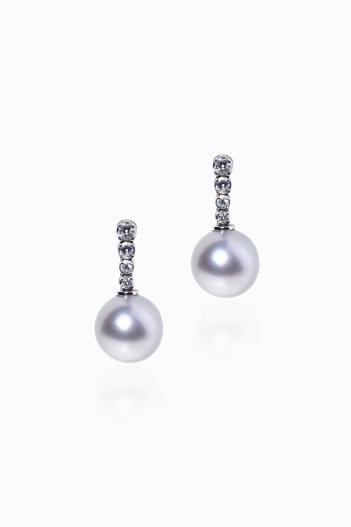 Peso gr 10 7 in oro bianco corpo con diamanti taglio brillante per totali ct 0 30 ca terminanti con due perle australiane nei toni del grigio chiaro del diam. di mm 13 2