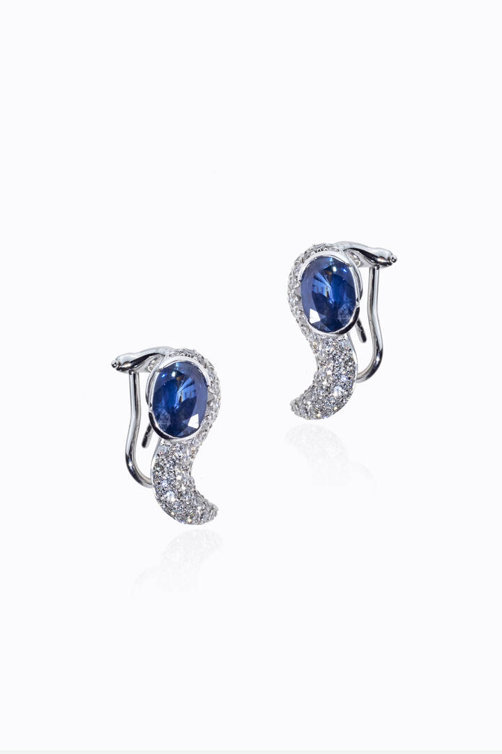 Peso gr 10 in oro bianco a lobo a volute in diamanti taglio brillante per totali ct 0 80 ca terminanti con due zaffiri Ceylon taglio ovale per totali ct 3 0 ca
