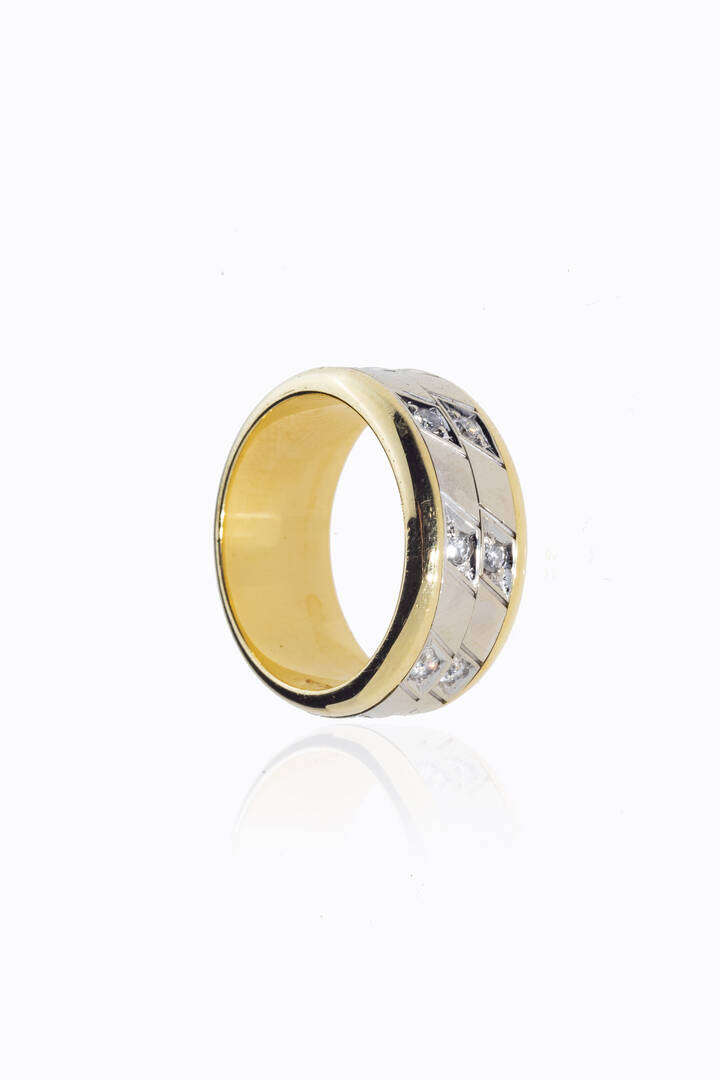 Peso gr 11 8 Misura 11 (51) Eternel in oro giallo firmata Pomellato con parte centrale in oro bianco composta da due fasce mobili decorate con diamanti taglio brillante per totali ct 0 50 ca.