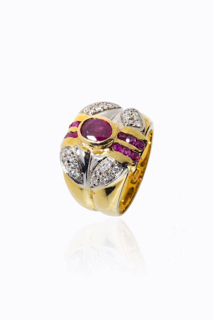 Peso gr 11 9 Misura 14 (54) in oro giallo e bianco sommità con rubino centrale e due fasce di rubini taglio rotondo per totali ct 1 0 ca pavé di diamanti taglio brillante per totali ct 0 25 ca