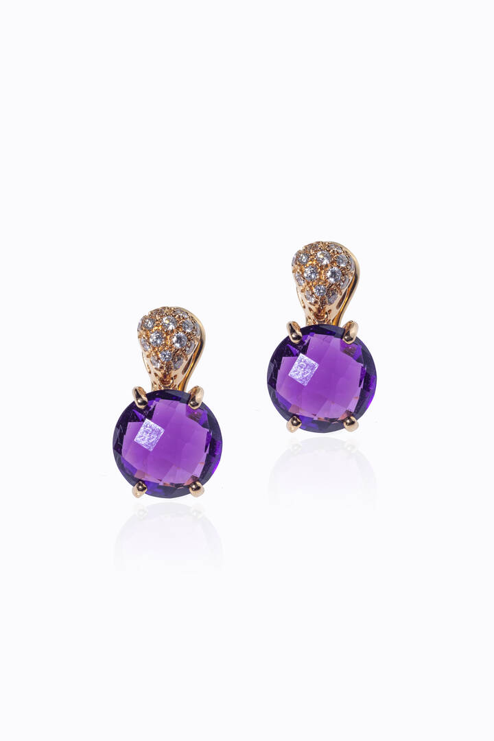 Peso gr 11 Coppia di orecchini in oro rosa firmato Alfieri & St. John con due ametiste taglio rotondo sfaccettate e goccia in pavé di diamanti per totali ct 0 30 ca