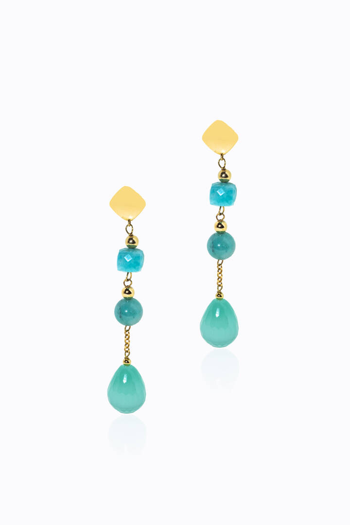 Peso gr 12 4 pendenti in oro giallo con cubi e sfere in amazzonite terminanti con gocce in occhio di gatto cabochon