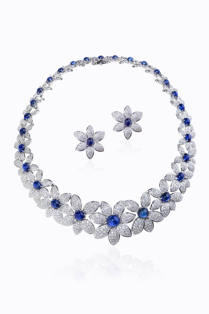Peso gr 127 2 composta da girocollo e coppia di orecchini con fiori in diamanti taglio brillante per totali ct 12 0 ca probabile colore G-H purezza IF-VVS e zaffiri cabochon per totali ct 34 ca