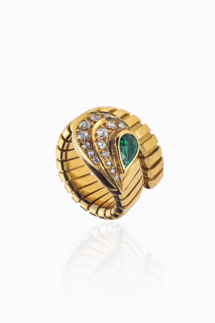 Peso gr 14 1 Misura 13 (53) in oro giallo lavorato a tubogas a forma di serpente con smeraldo taglio a goccia di ct 0 60 ca e diamanti taglio brillante per totali ct 0 20 ca