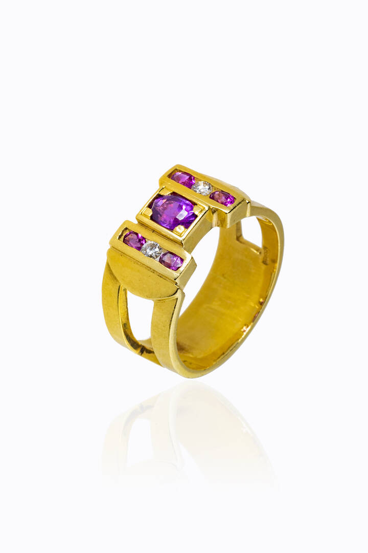 Peso gr 14 Misura 24 (64) in oro giallo sommità geometrica con al centro ametiste taglio ovale e due diamanti taglio brillante per totali ct 0 05 ca probabile colore G-H purezza IF-VVS