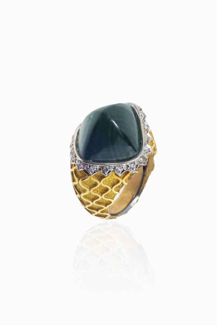 Peso gr 15 2 Misura 11 (51) in oro giallo satinato e bianco sommità con malachite taglio piramidale. Diamantini taglio 8/8 per totali ct 0 20 ca