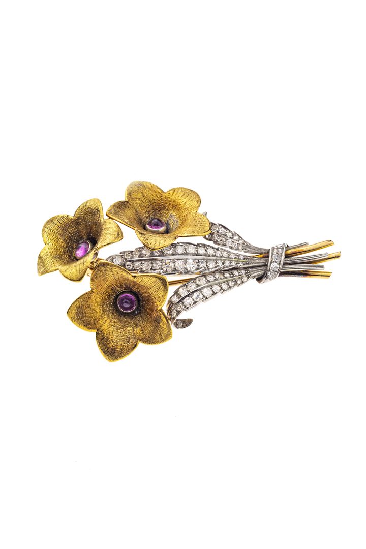 Peso gr 15 8 cm 6x4 in oro giallo satinato e bianco anni '50 a forma di ramo fiorito con tre fiori con diamanti taglio 8/8 per totali ct 0 65 ca e tre rubini cabochon.