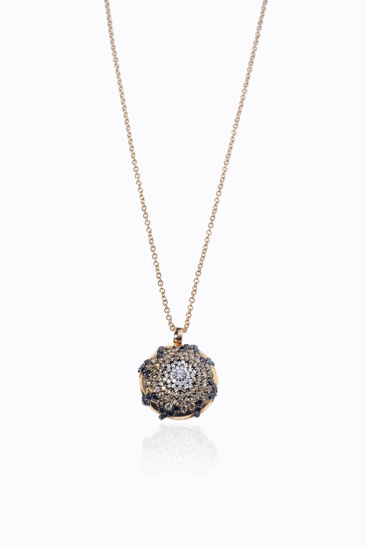 Peso gr 16 0 in oro rosa a di forma rotonda con decoro floreale in diamanti taglio brillante di colore bianco nero e cognac per totali ct 2 19 ca probabile colore G-H purezza IF-VVS