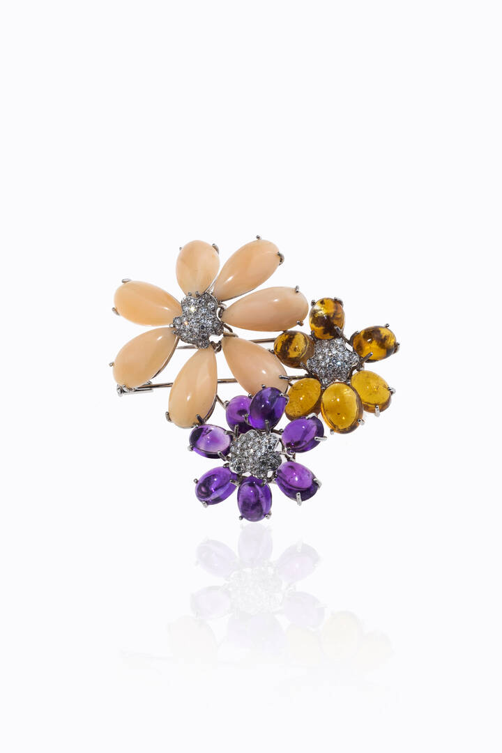 Peso gr 20 9 cm 5x6 in oro bianco composta da tre fiori con petali in corallo rosa taglio cabochon; ametiste e citrini taglio ovale cabochon; diamanti taglio 8/8 per totali ct 0 70 ca Accompagnato da certificato telematico di autenticità Ce.S.Ar. Centro Studi Archeometrici.