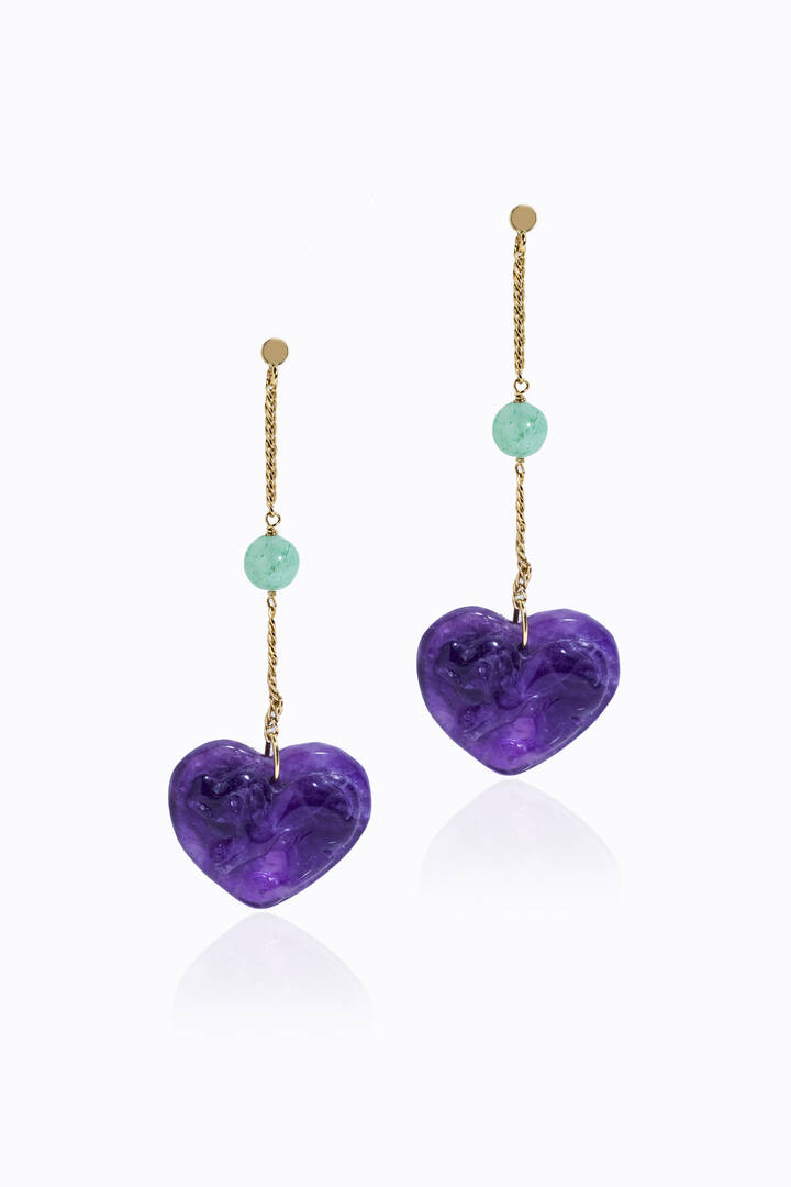 Peso gr 22 2 pendenti in oro giallo con ametiste a cuore incise con cani e sfere di avventurina