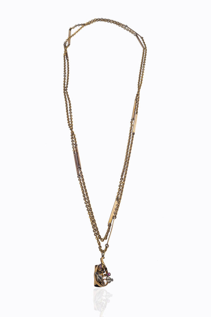 Peso gr 24 2 in oro a bassa caratura con segmenti rigidi alternati a maglia ad anello; al centro ciondolo con piccoli rubini (uno mancante)