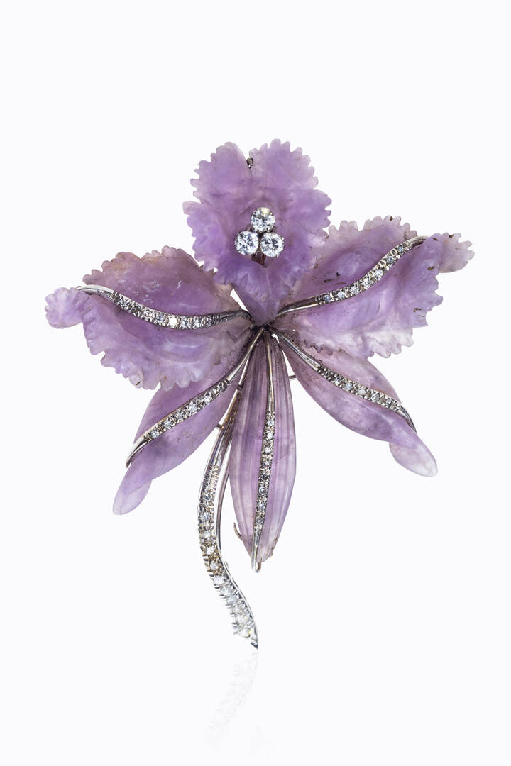 Peso gr 28 8 cm 8x6 5 in oro bianco con orchidea in pasta vitrea di color viola e diamanti taglio 8/8 e diamante per totali ct 0 80 ca