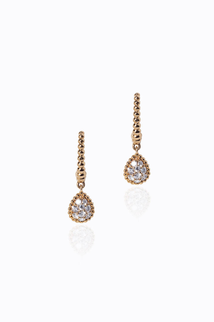 Peso gr 3 0 in oro rosa a monachella con gocce lavorate a grani con diamanti taglio brillante per totali ct 0 44 ca probabile colore G-H purezza IF-VVS
