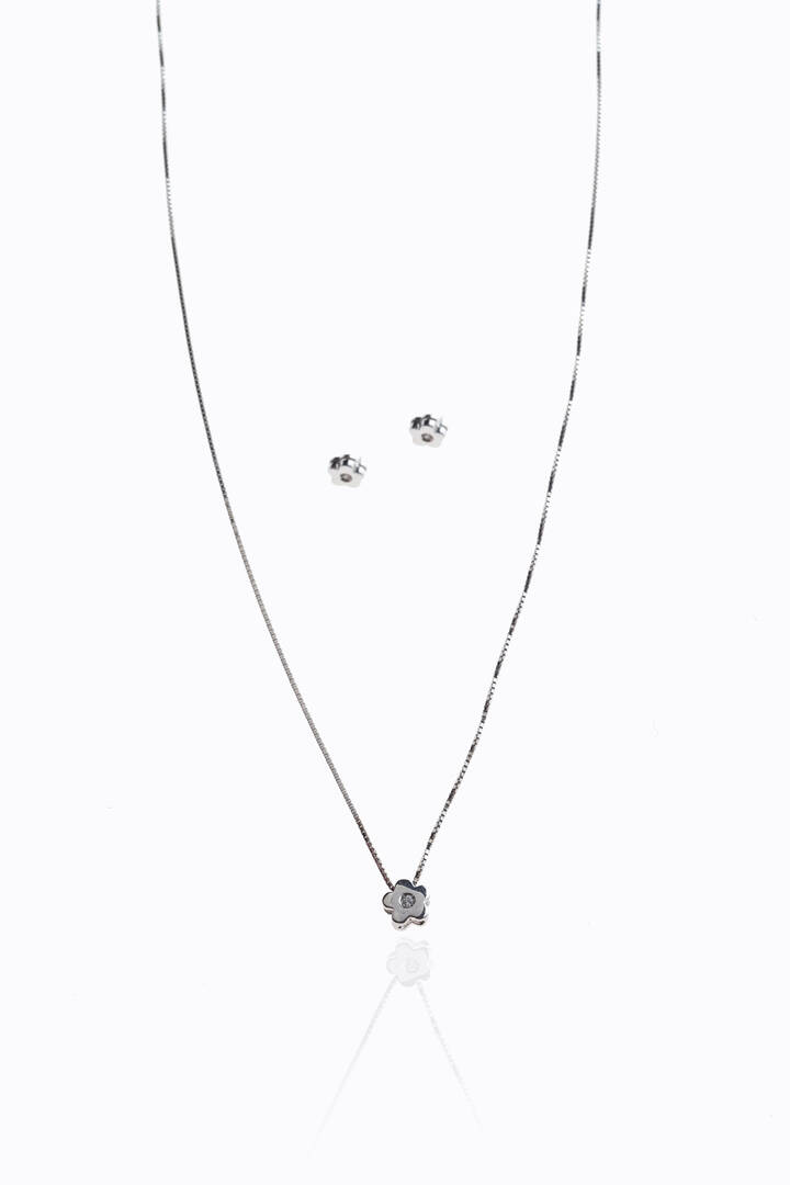 Peso gr 3 6 composta da coppia di orecchini e catena con ciondolo a forma di fiore stilizzato con diamanti taglio brillante per totali ct 0 03 ca probabile colore G-H purezza IF-VVS