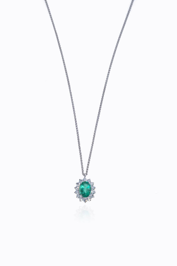 Peso gr 3 6 in oro bianco con smeraldo taglio ovale di ct 1 22 contornato da diamanti [..]