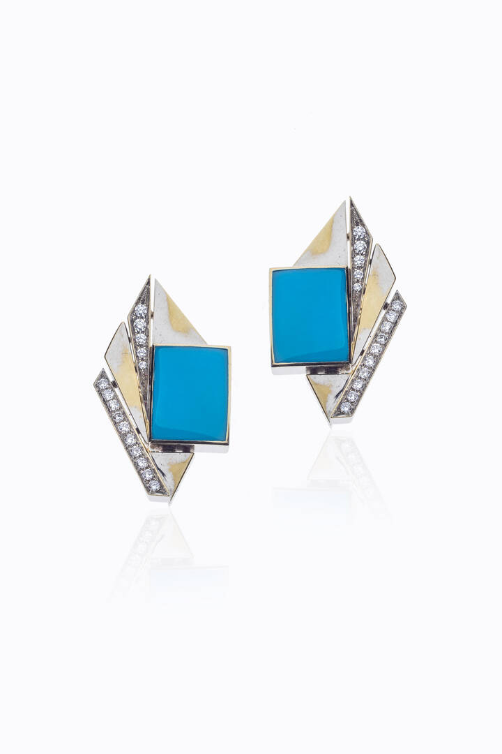 Peso gr 30 1 Coppia di orecchini in oro bianco a clip anni '70 firmati Sauli di forma geometrica con due turchesi taglio rettangolare e file di diamanti taglio brillante per totali ct 0 60 ca