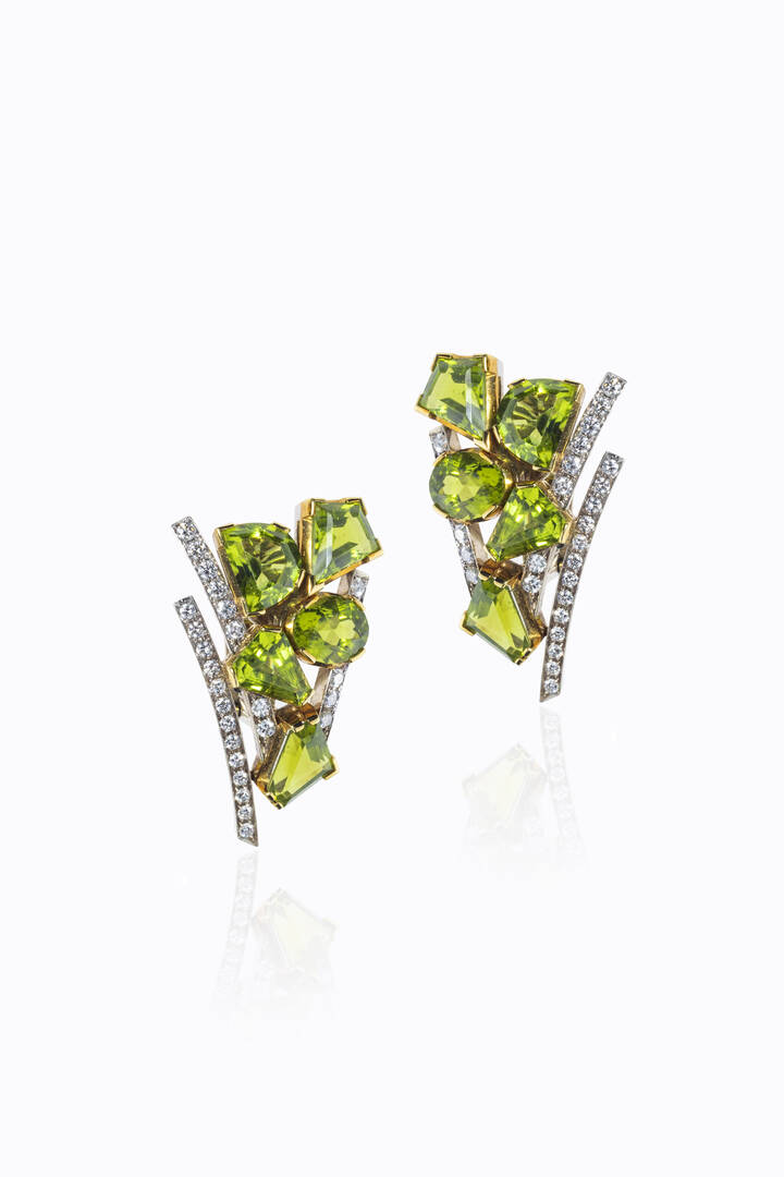 Peso gr 31 7 Coppia di orecchini in oro bianco anni '70 a clip firmati Sauli di forma geometrica con peridoti taglio fantasia e file di diamanti taglio brillante per totali ct 1 0 ca