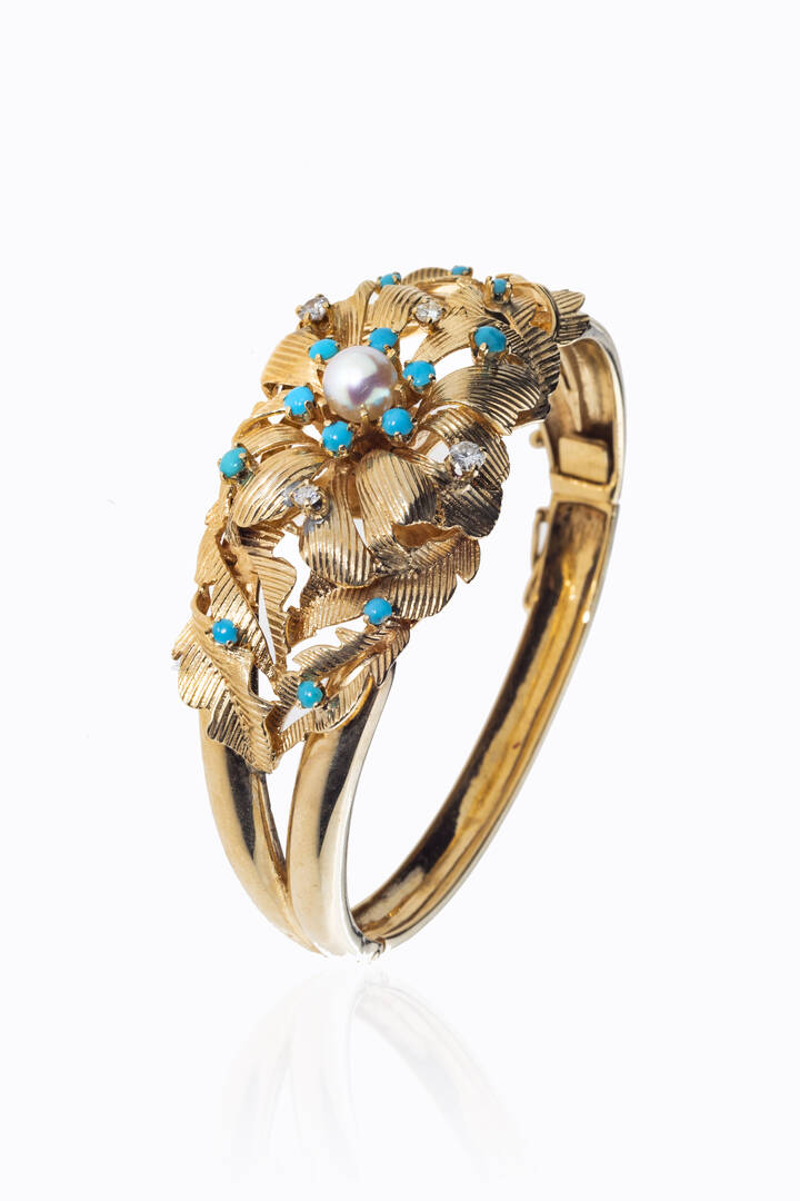 Peso gr 34 5 rigido in oro rosa sommità lavorata a fiore con sfere di turchesi; al centro piccola perlina giapponese e diamanti taglio brillante a decoro per totali ct 0 25 ca