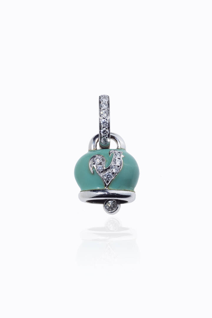 Peso gr 4 2 Ciondolo a forma di campanella firmato Chantecler con smalto turchese e piccoli diamantini taglio brillante per totali ct 0 12 ca
