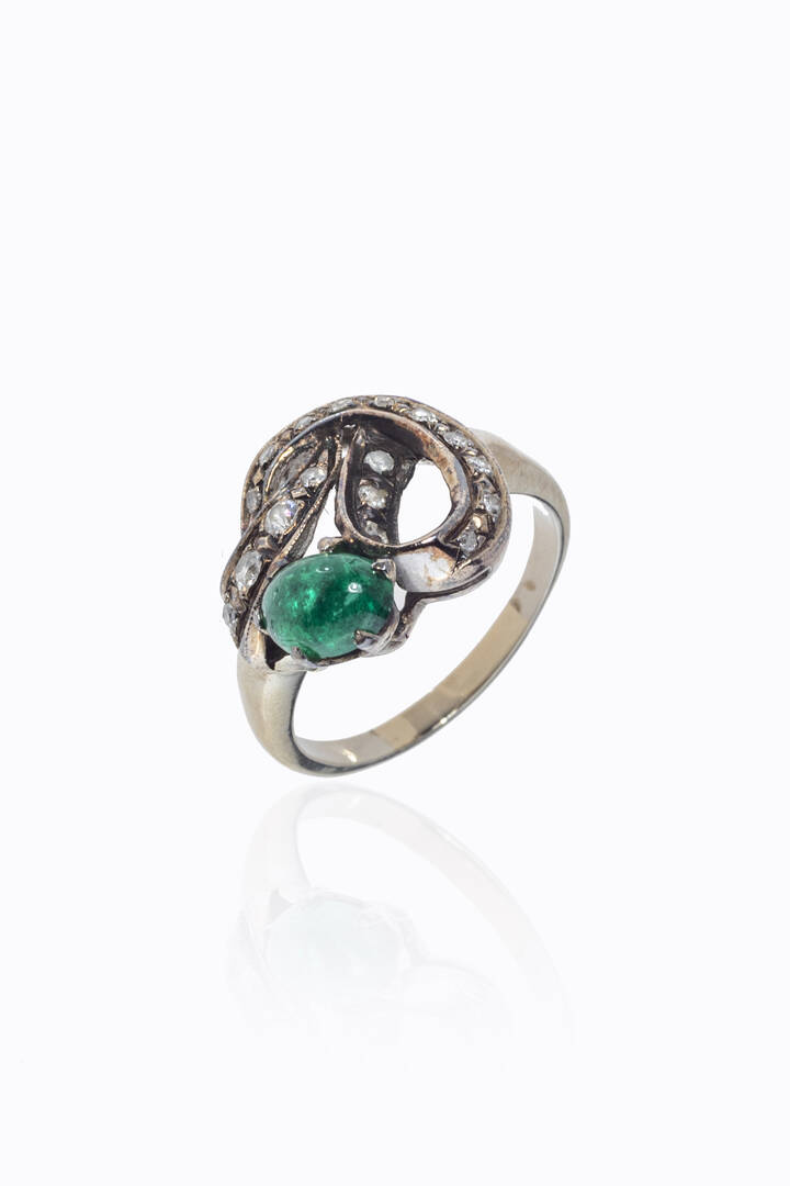 Peso gr 4 4 Misura 16 (56) in oro bianco 14 Kt XIX secolo sommità ad intreccio con diamanti taglio brillante di vecchio taglio e 8/8 per totali ct 0 25 ca e uno smeraldo cabochon di ct 0 70 ca