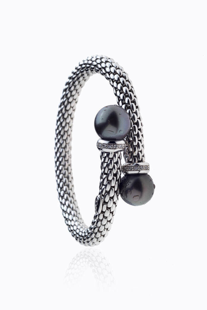 Peso gr 41 3 Bracciale semirigido in oro bianco firmato Fope lavorato ad intreccio; terminali con due perle Tahiti del diam. di mm 12