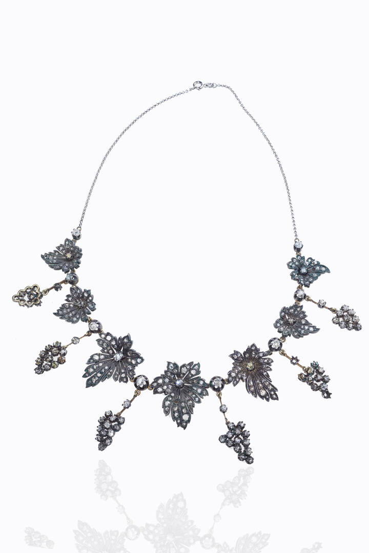 Peso gr 48 in oro bianco parte centrale del XIX secolo in argento ed oro a bassa caratura con foglie e tralci d'uva in diamanti taglio brillante di vecchio e rosette per totali ct 6 0 ca (sei mancanti)