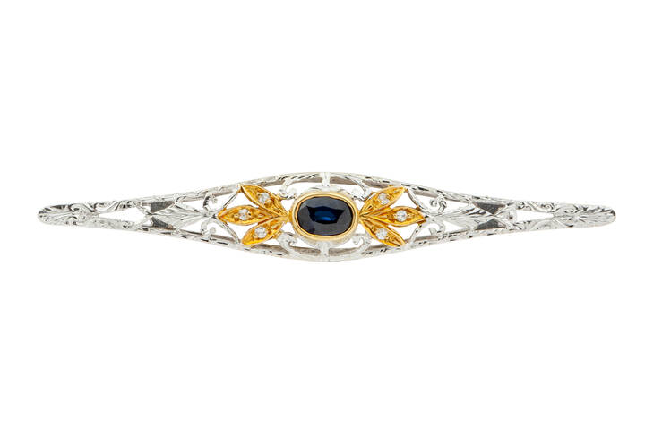 Peso gr 5 0 in oro giallo e bianco a losanga con zaffiro taglio ovale di ct 0 60 ca al centro e diamanti taglio brillante per totali ct 0 06 ca