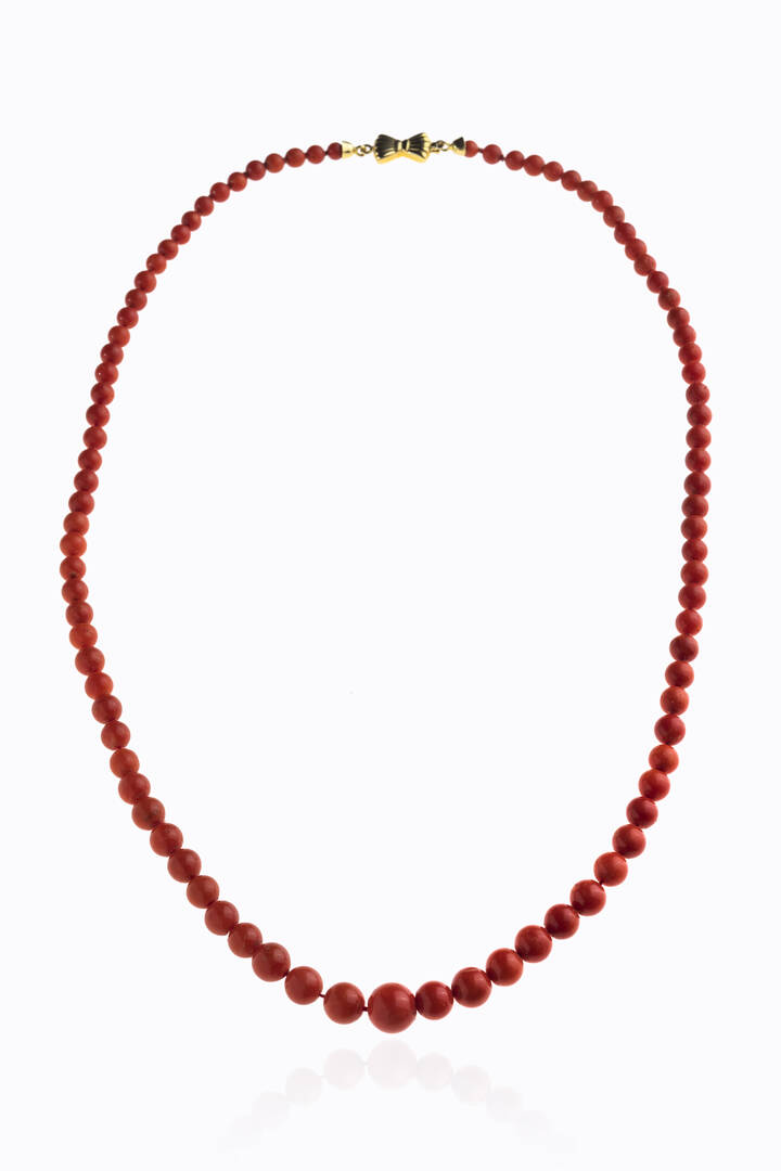 Peso gr 52 1 Lunghezza cm 70 composta da un filo di sfere di corallo mediterraneo a scalare dal diam. di mm 11 3 a 6. Chiusura in oro giallo a fiocco Accompagnato da certificato telematico di autenticità Ce.S.Ar. Centro Studi Archeometrici.
