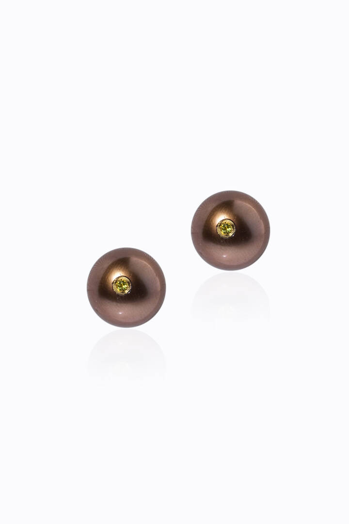 Peso gr 6 7 in oro giallo a lobo con due perle australiane varietà chocolate del diam. di mm 11 al centro due diamantini di colore giallo per totali ct 0 02