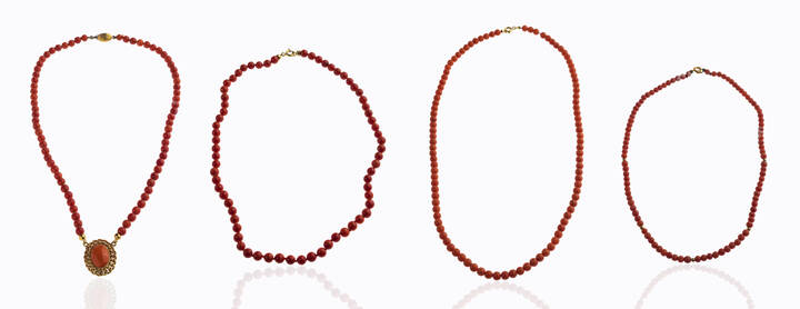 Peso gr 61 3 Lunghezza cm 46 40 37 (difetti) 43 con sfere di corallo dal diam di mm a 4 2 a 5 6 ca. Chiusure e decori in oro giallo. Difetti Accompagnato da certificato telematico di autenticità Ce.S.Ar. Centro Studi Archeometrici.