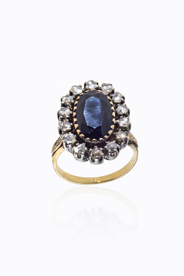 Peso gr 7 6 Misura 15 (559 in oro giallo a bassa caratura ed argento sommità a margherita con al centro zaffiro taglio ovale di ct 4 50 ca contornato da rosette di diamanti per totali ct 0 70 ca