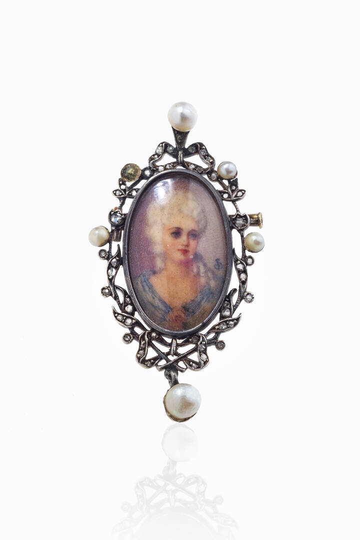 Peso gr 7 7 cm 5x2 5 in oro a bassa caratura ed argento XIX secolo con al centro miniatura raffigurante ritratto femminile. Perline (una mancante) e rosette a decoro