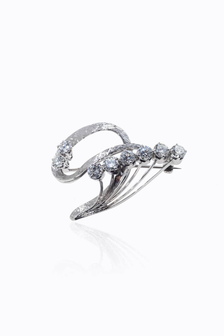 Peso gr 7 9 cm 2 5x4 in oro bianco satinato a voluta anni '50 con diamanti taglio brillante per totali ct 1 50 ca probabile colore H purezza IF-VVS