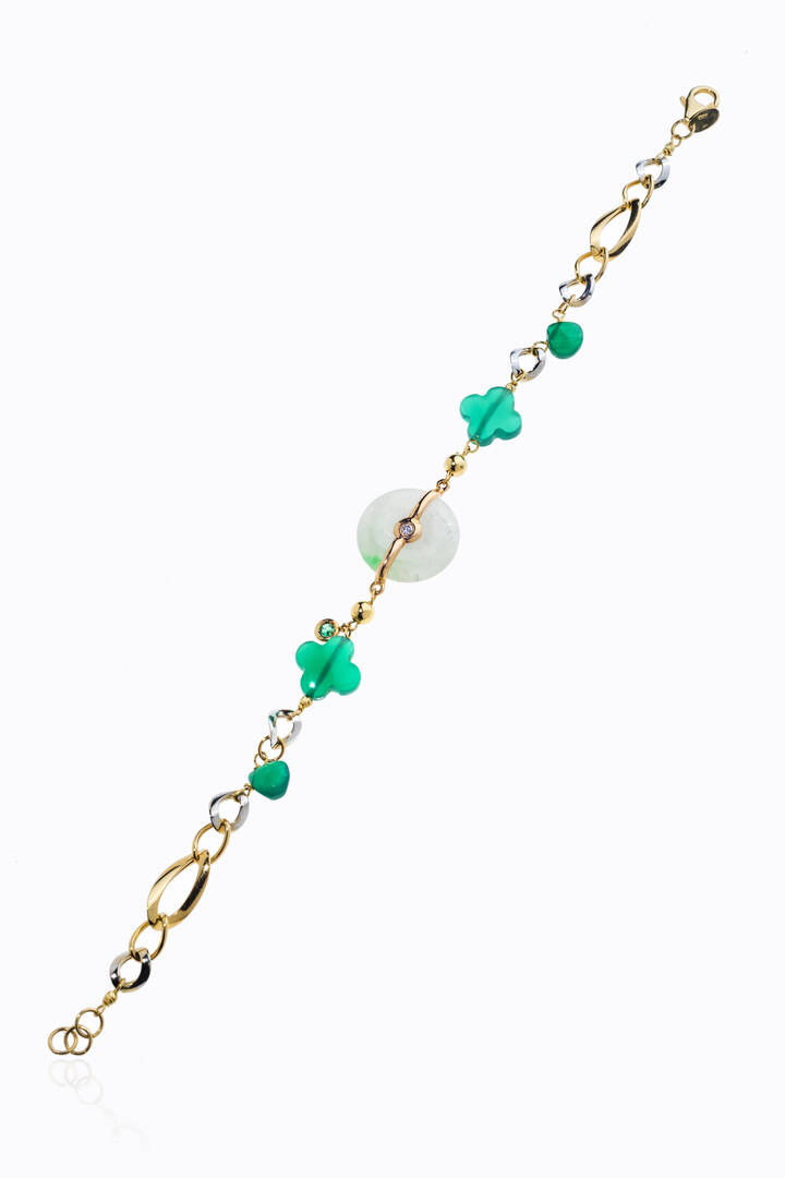 Peso gr 8 3 Lunghezza cm 18 composto da anelli ovalizzati in oro giallo e bianco; al centro disco in giada e quadrifogli in agata verde. Diamanti taglio brillate per totali ct 0 03ca