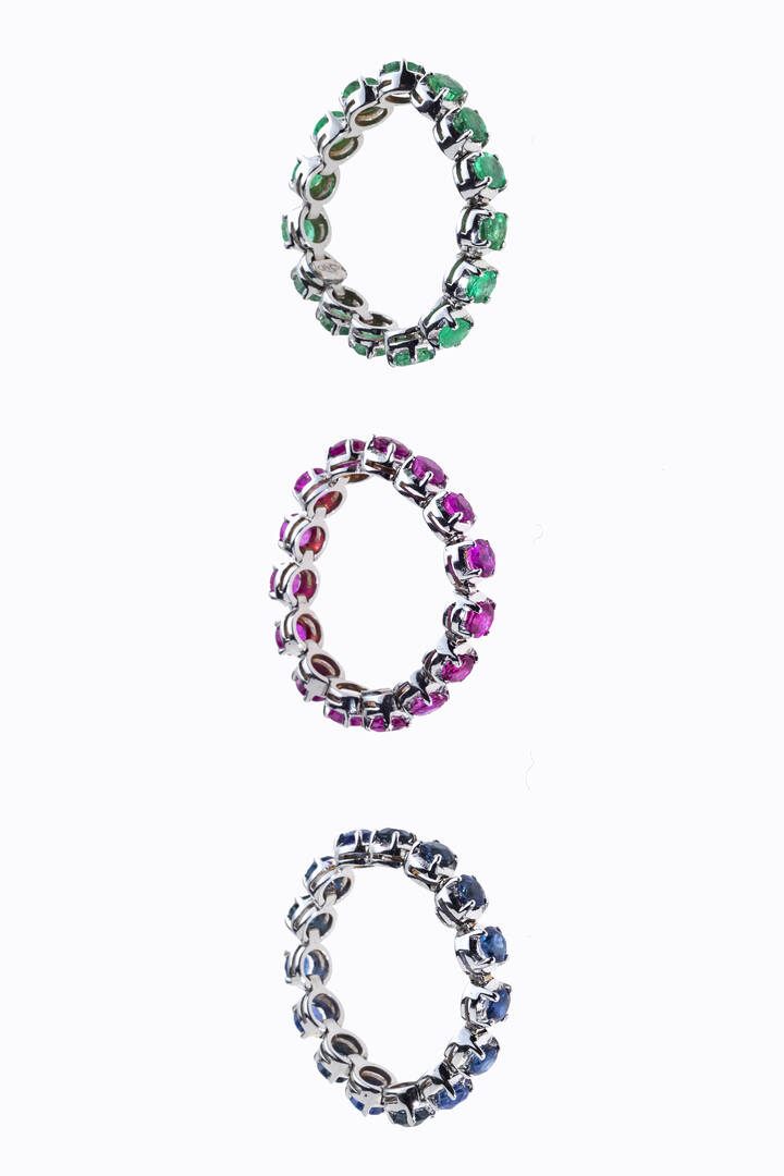 Peso gr 9 3 Misura 15 (55) in oro bianco con fila di smeraldi taglio rotondo per totali ct 1 20 ca fila di zaffiri per totali ct 1 50 ca e rubini taglio rotondo per totali ct 1 50 ca