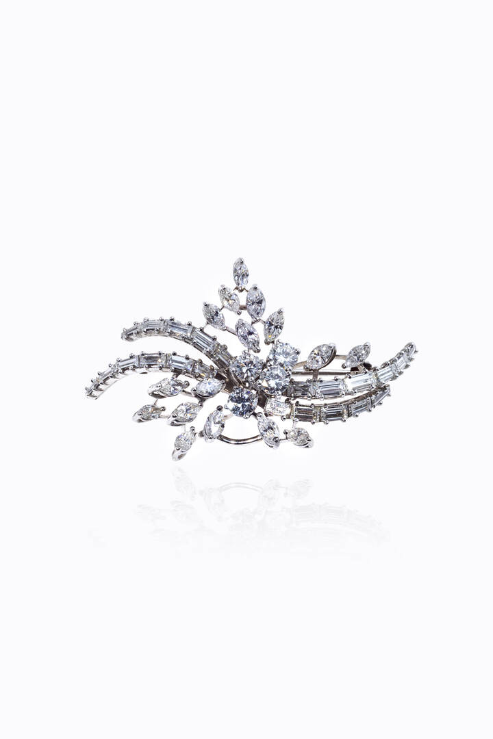 Peso gr 9 7 cm 3x5 in oro bianco a voluta con diamanti taglio brillante carré e navette per totali ct 4 0 ca probabile colore G-H purezza IF-VVS