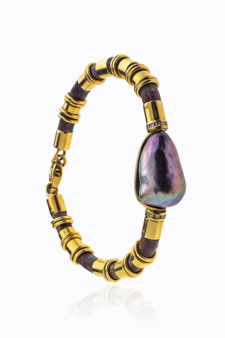 Peso lordo gr 30 4 con struttura in cuoio e anelli in oro giallo al centro grande perla Tahiti scaramazza nei toni del grigio scuro e diamanti taglio brillante per totali ct 0 20 ca